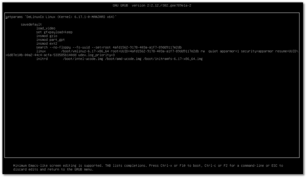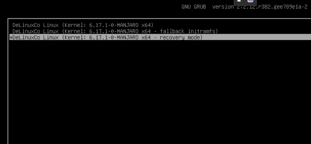 I propose that a “SAFE MODE” entry be added to the Grub menu, by duplicating the GRUB_CMDLINE_LINUX_DEFAULT= and adding a space and the number 3 at the end, this will take the user directly to runlevel 3, or the command prompt. From here the user can access the system sans a gui but generally fix just about anything. This is much easier than having to boot into an ISO and then chroot into the existing system, the latter being a last resort.