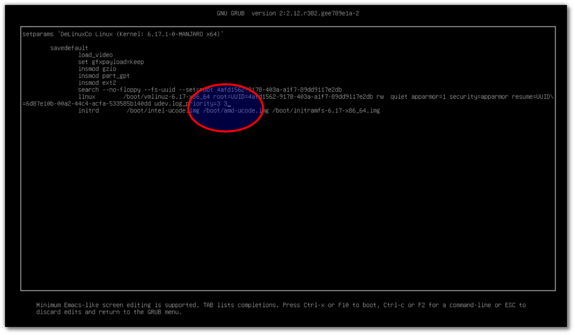 For those not familiar with the process, at the Grub menu, go to Advanced Options > then select one of the kernels and hit the letter “e” on the keyboard.