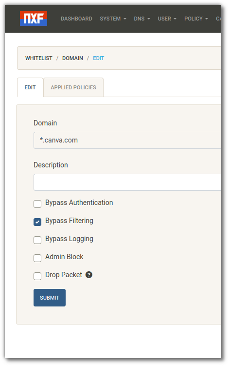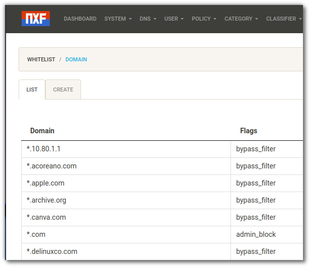 Once both apps are setup you can add items to the WHITELIST, to block all .com site, you would use a wildcard of *.com and set it to "Admin Block", but if you have a certain site that you still want to access, you add another WHITELIST entry but add it as a filter bypass. as an example, if I add canva.com, it would be the only .com site that the machine would be able to access.
