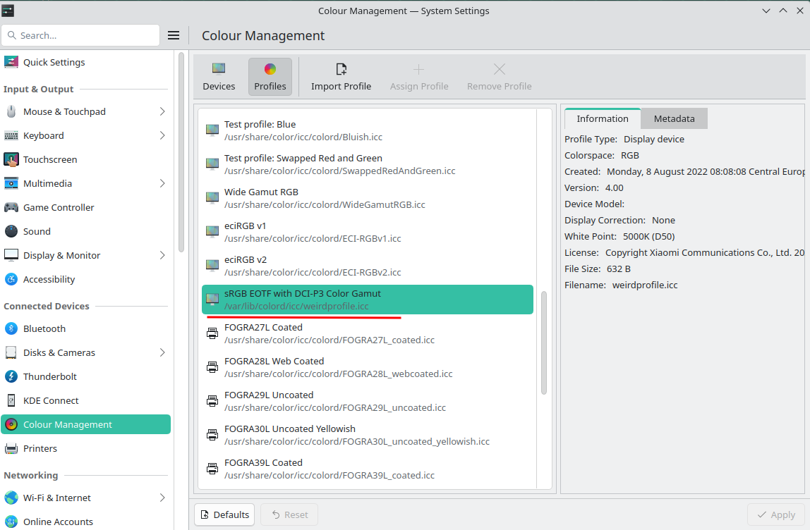 This is what I suggested earlier. Proprietary format. Ypu’ll need to add the colour profile (via System Settings → Display and Monitor I believe), but trying to find a source for the appropriate one is proving a bit of a headache.