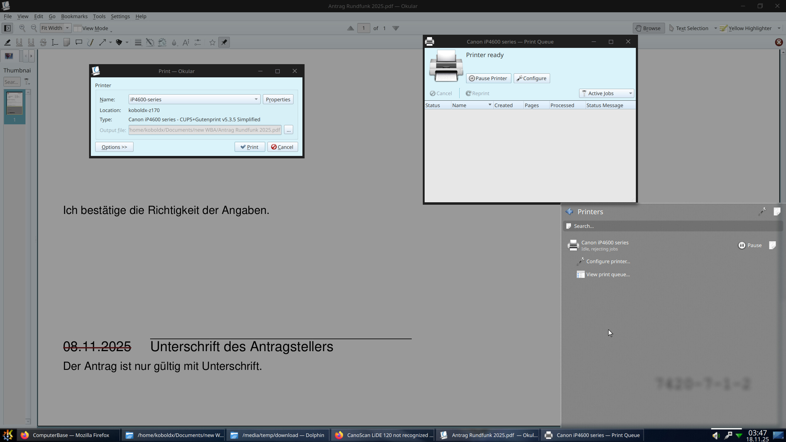 My Canon iP4600 was always working Plug & Play, i just powered the Printer ON and Plug it on my USB Port. Manjaro detects the correct Printer with its name, but when i click Print. Then nothing is happening, Printer LED’s shows ready but no Printer Job is in que after clicking print. There is also no error visible ![]()