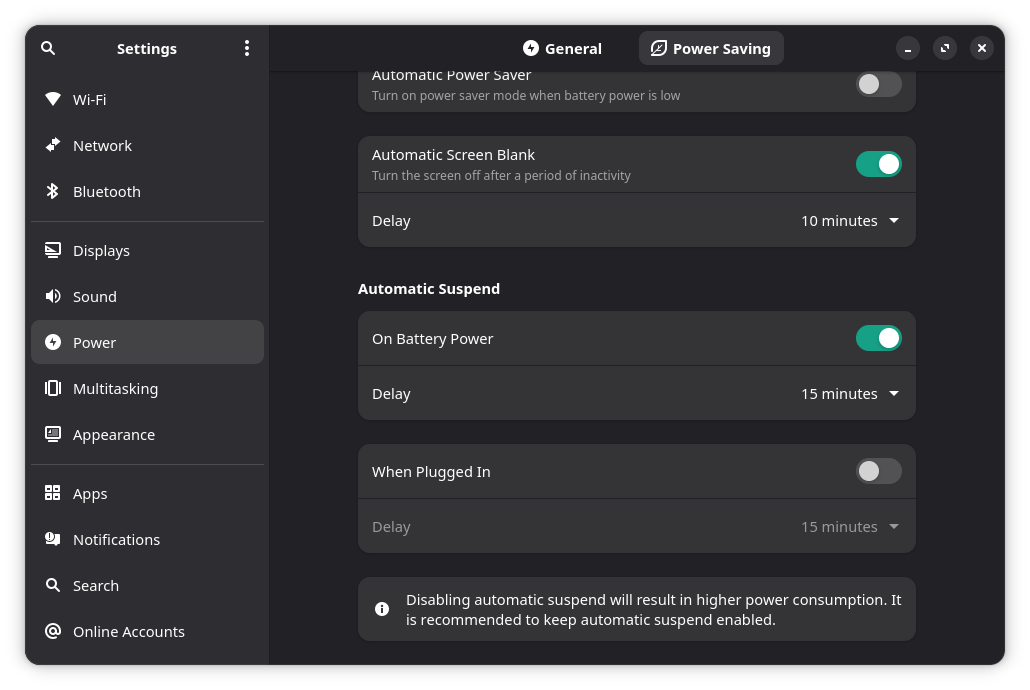 It write in Settings → Power: “Disabling automatic suspend will result in higher power consumption. It is recommended to keep automatic suspend enabled.”