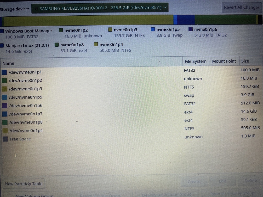 Delete existing manjaro partitions…including the 500mb no label Fat32 one.