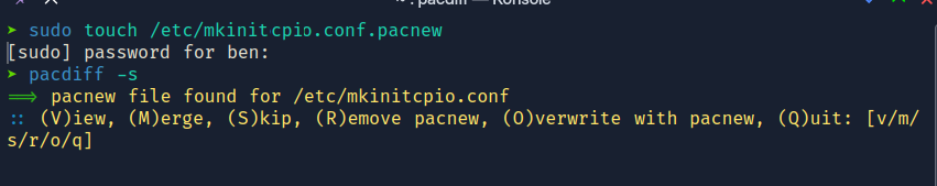 [john1@manjaro ~]$ sudo pacdiff -s -f
