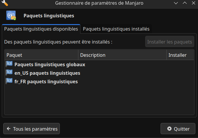 Sinon clic droit sur Gestion de paramètres Manjaro dans les icônes près de l’heure, et Paquets Linguistiques, et installe tous les paquets de langue qu’il te manque directement par ici, tu as tout de listé par ici.