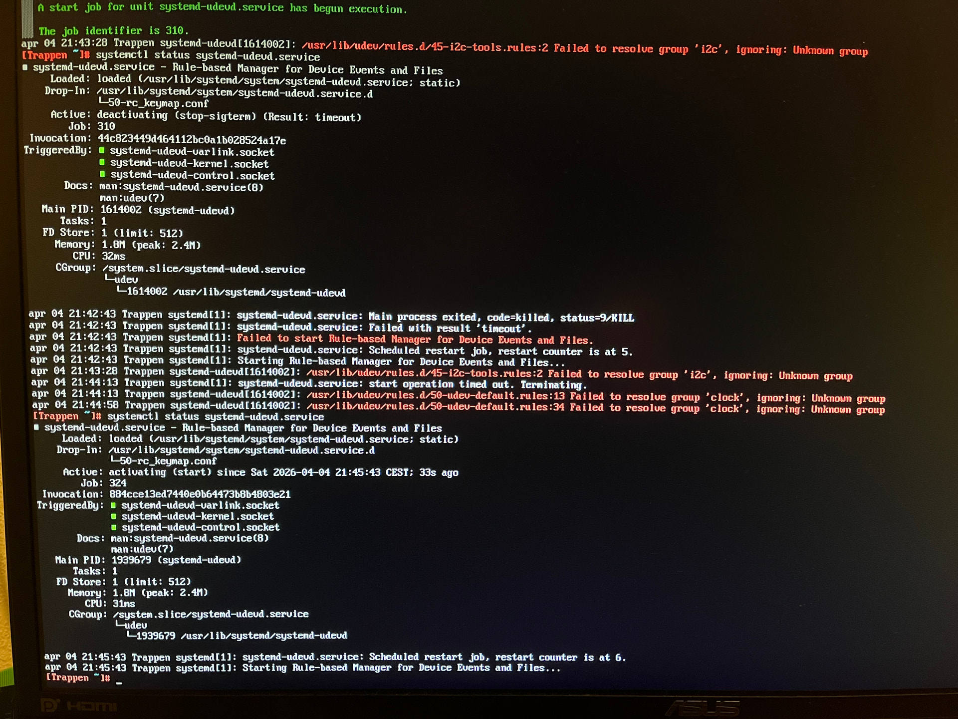 When just letting my system try to boot, I eventually come to a terminal screen telling me I’m in “Emergency mode”, and asking me to enter the root password and hinting on running “journalctl -xb”.