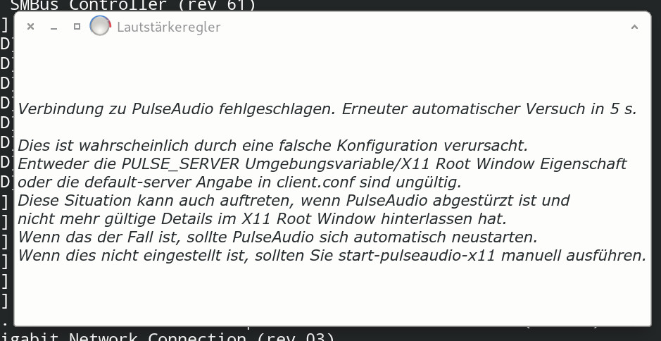 It is said: Verbindung zu PulseAudio fehleschlegen (Connection to pulseaudio failed)