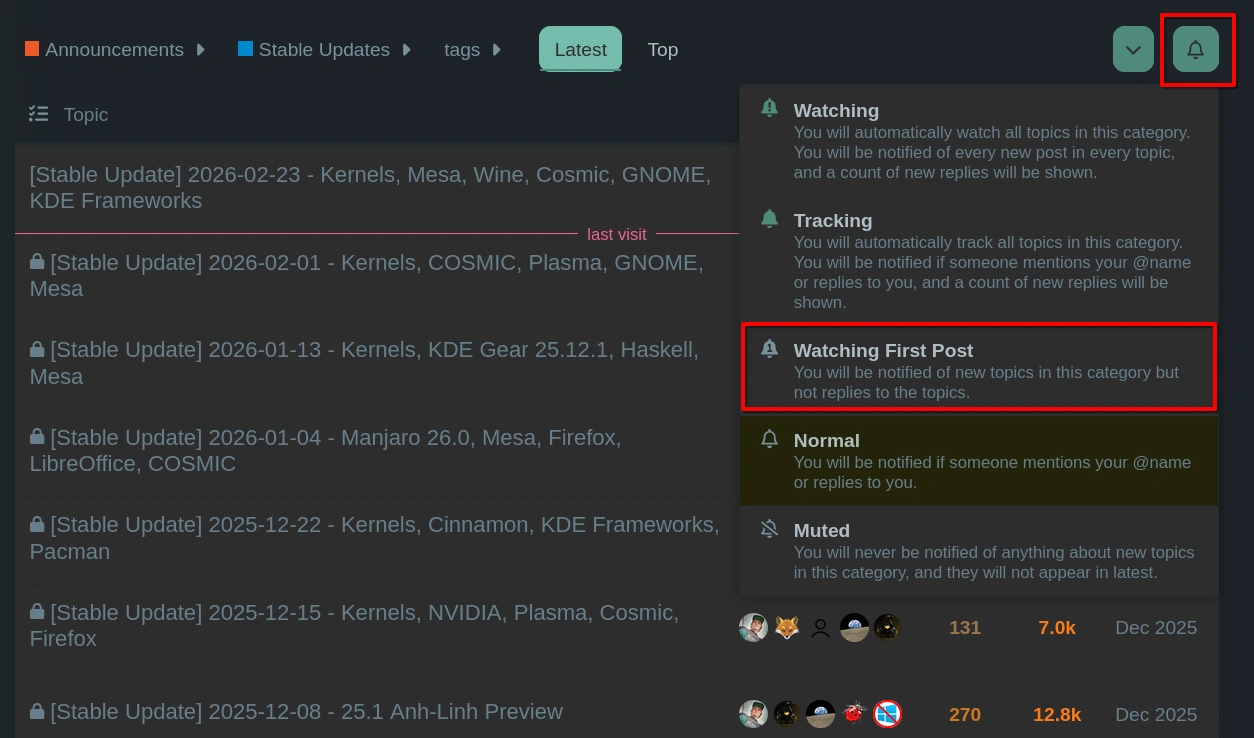 I subscribe to all new forum posts https://forum.manjaro.org/new Most are of no interest to me, but every once in awhile. Takes a few minutes a day to scan and read, which I do in the morning as I read the news.
