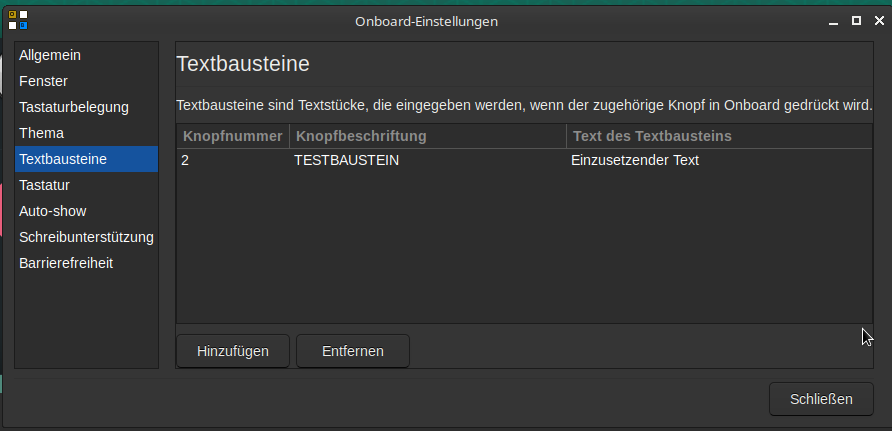 Ich kann das Problem bestätigen, habe aber auch keine Lösung. Man kann mit Onboard Textbausteine konfigurieren, z.B. “Textbaustein 2” = “das ist ein Test” und der entsprechenden virtuellen Taste einen Namen geben, z.B. “Test”
