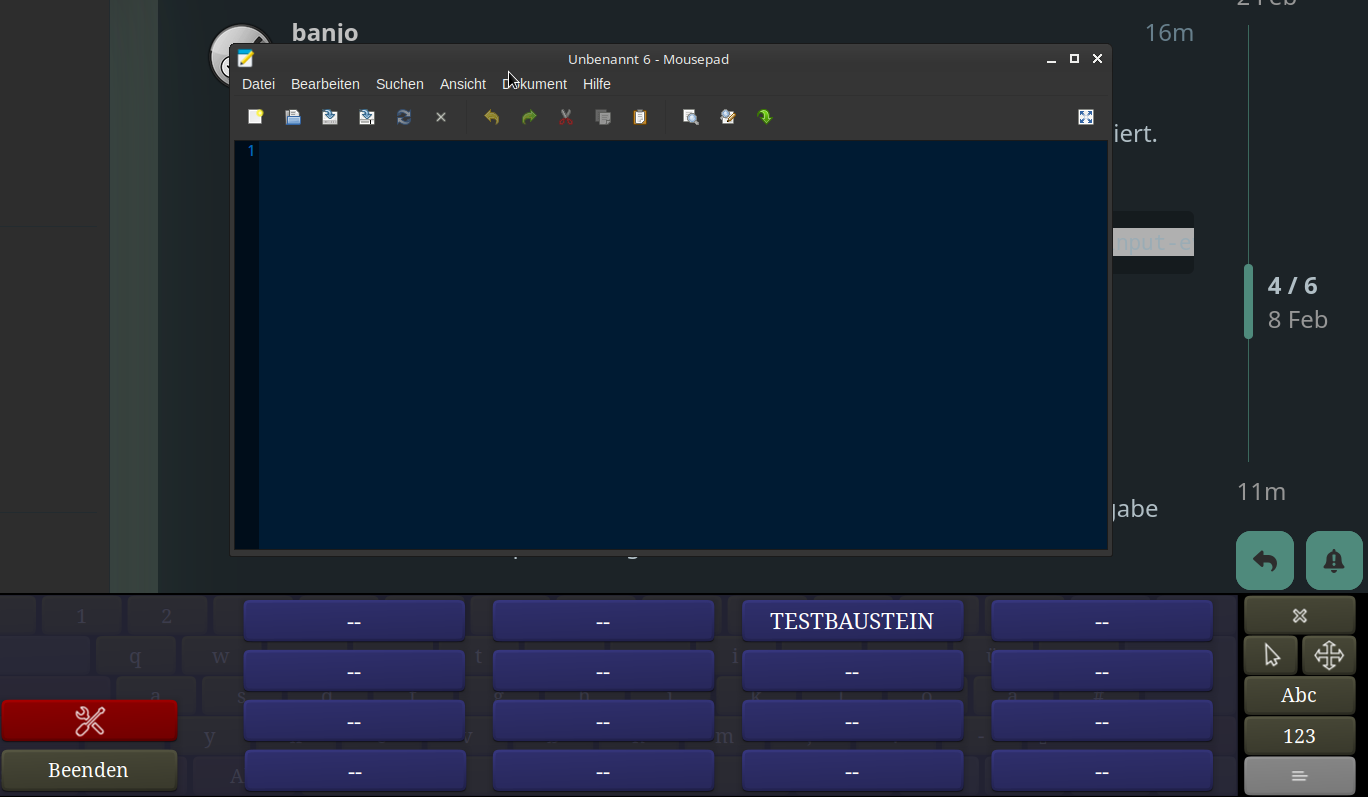 Nach der Programmbeschreibung müsste nun in Onboard eine Taste mit der Beschriftung “Test” auftauchen. Tut es aber nicht. Dies geschieht nur in der “Konfigurationsebene”, dort gibt es dann diese Taste. Da man sich aber in der Konfiguration befindet führt das Anklicken dieser Taste nur dazu, dass man sie neu konfigurieren kann. Ist für mich logisch, aber eigentlich sollte bei Auswahl der Taste “Ziffernblock und Textbausteine” (beschriftet mit 123) mindestens auch virtuelle Tasten auftauchen, die so wie in der Konfiguration beschriftet sind und den gewünschten Textbaustein auslösen.