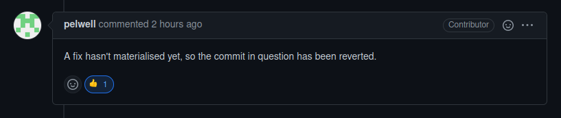 Iâm still patching. This has been a long process with this issue; been going on for 2 weeks. They have narrowed down my patch some to address the issue but they still are not done anything yet on their side. Their last post said âA revert is likely, unless we find a fix first.â