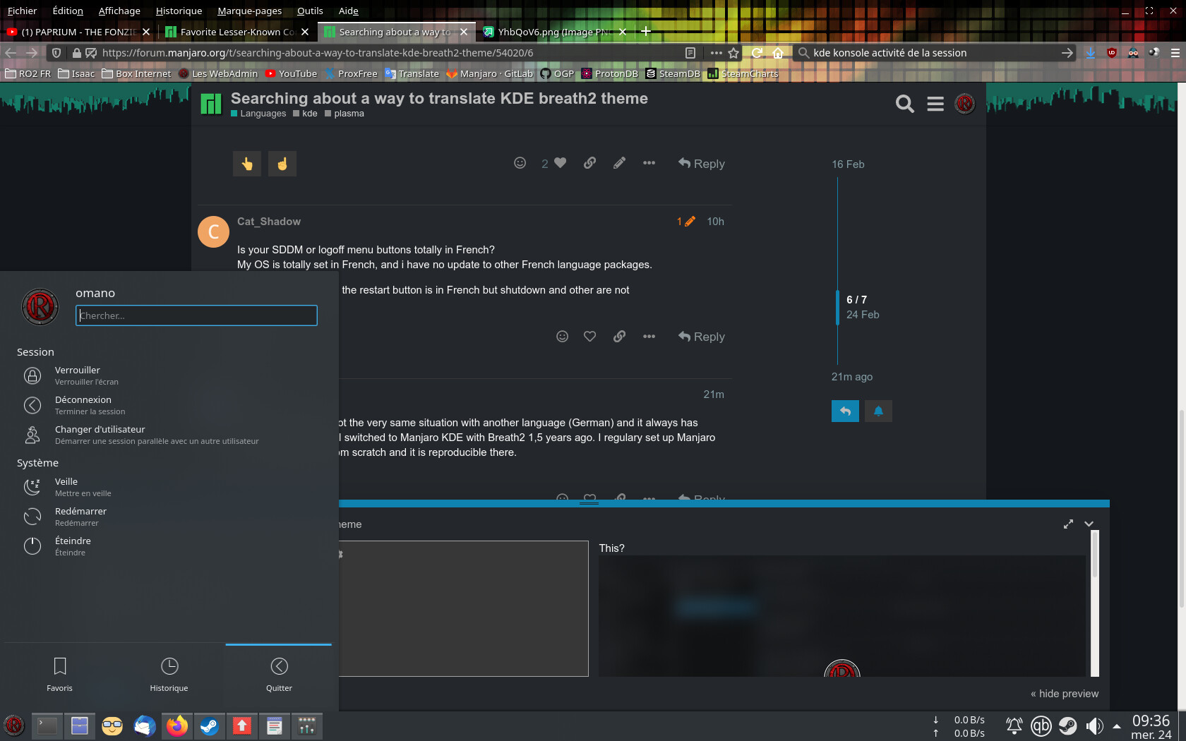 Actually, the kde logout menu buttons and sddm buttons (shutdown, restart…), in the KDE’s Breath2 theme french translation are still in english.