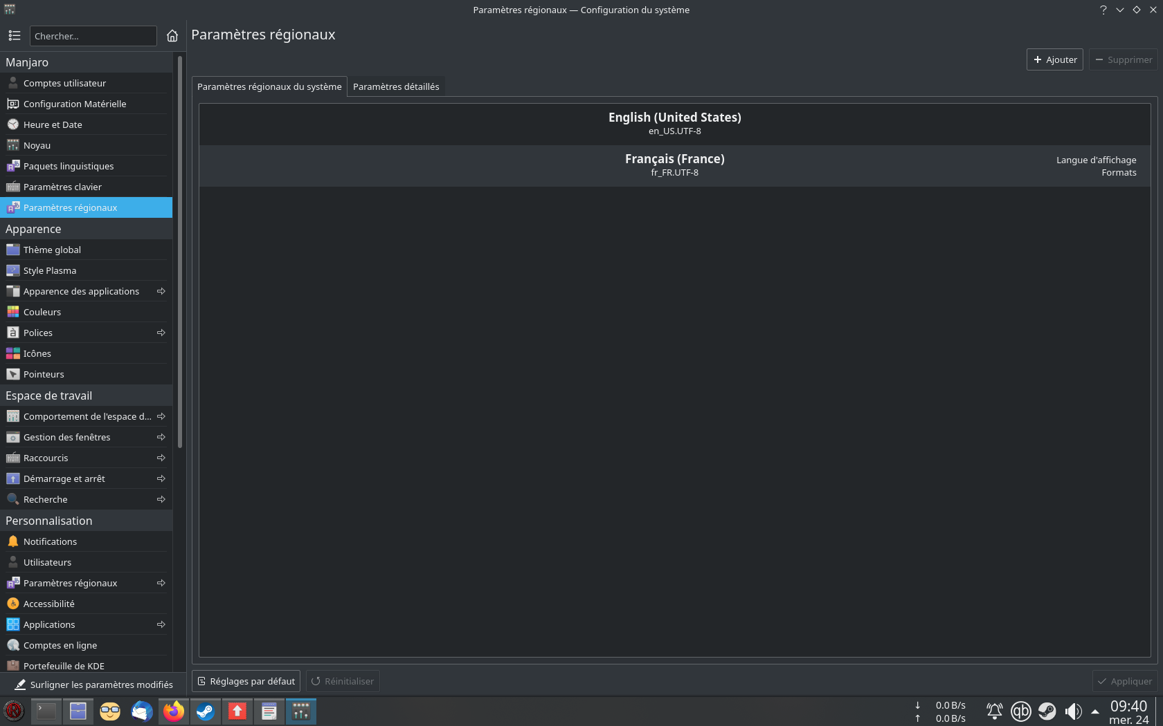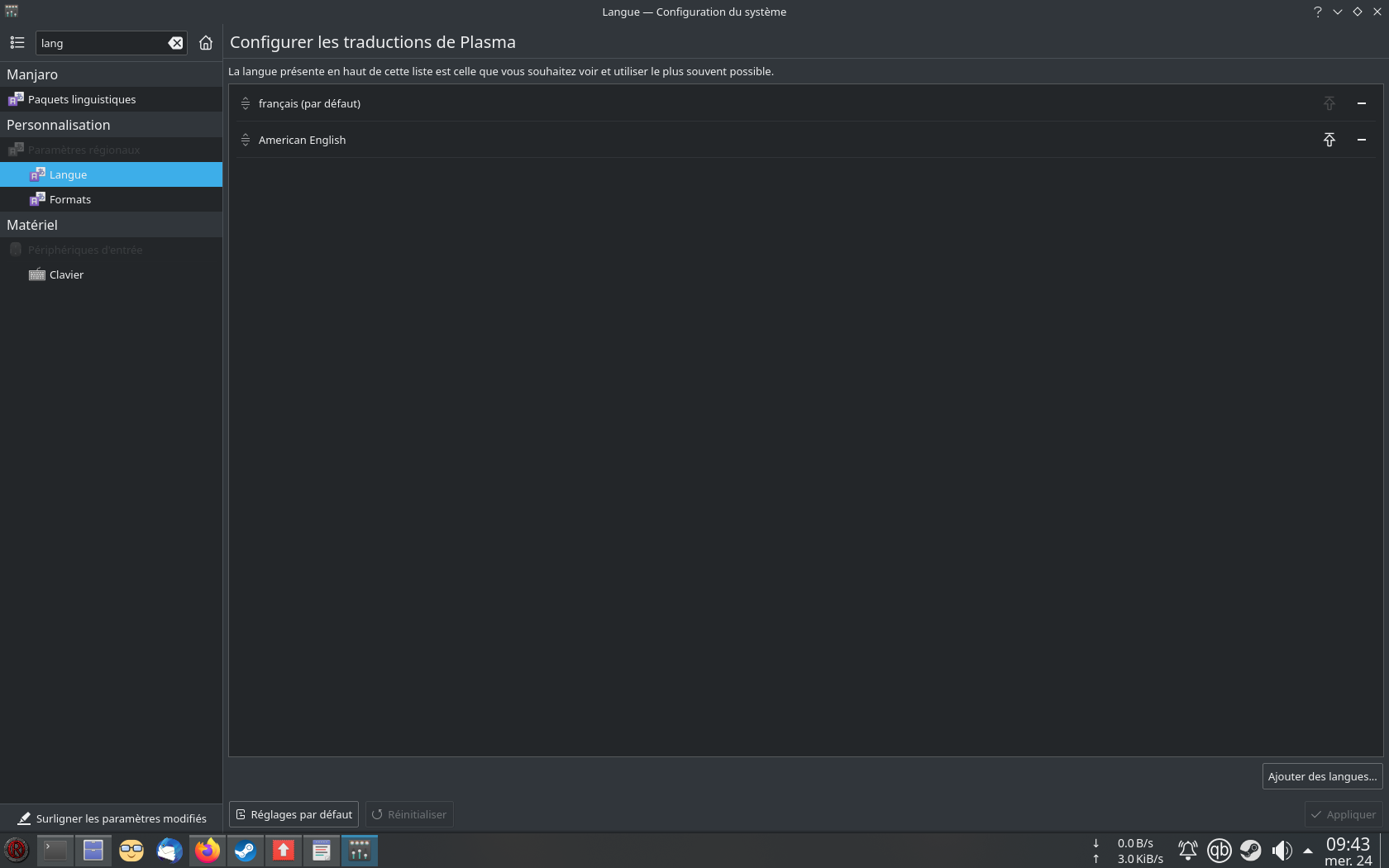 Maybe look if you’re not missing some translation packages from Manjaro Settings (search lang it will list related menus) → “Paquets Linguistiques”. Also make sure you have set the system languages properly maybe?