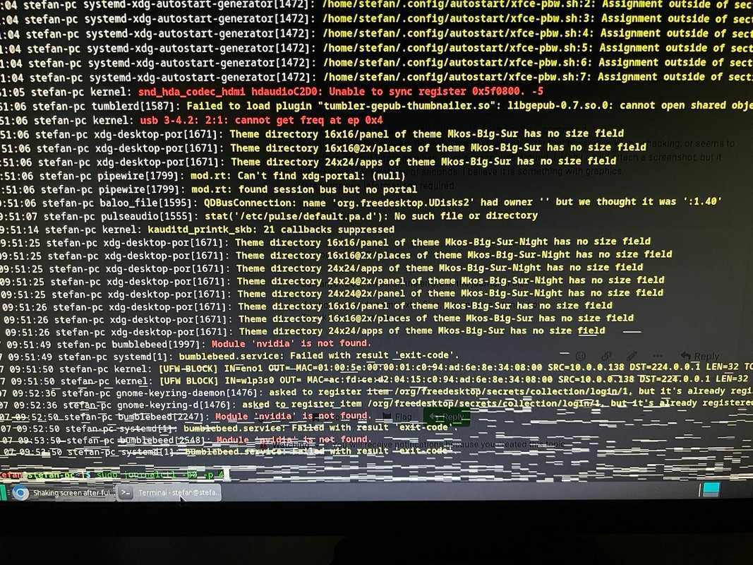 Everything seemed to work fine, until my next reboot. After that my screen keeps shacking, or seems to be a video error. It happens when I move the mouse around. I wish I could attach more screenshot, but it only happens for fractions of seconds. I believe it is something with graphics.