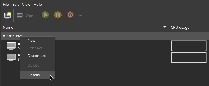 Es ist möglich, Bibliotheken – benutzerdefinierte Speicherorte – zu verwalten, indem Sie auf die Eigenschaften des QEMU/KVM-Eintrags im Virtual Machine Manager zugreifen. Klicken Sie mit der rechten Maustaste auf → Details oder doppelklicken Sie auf den Eintrag → Registerkarte „Speicher“.