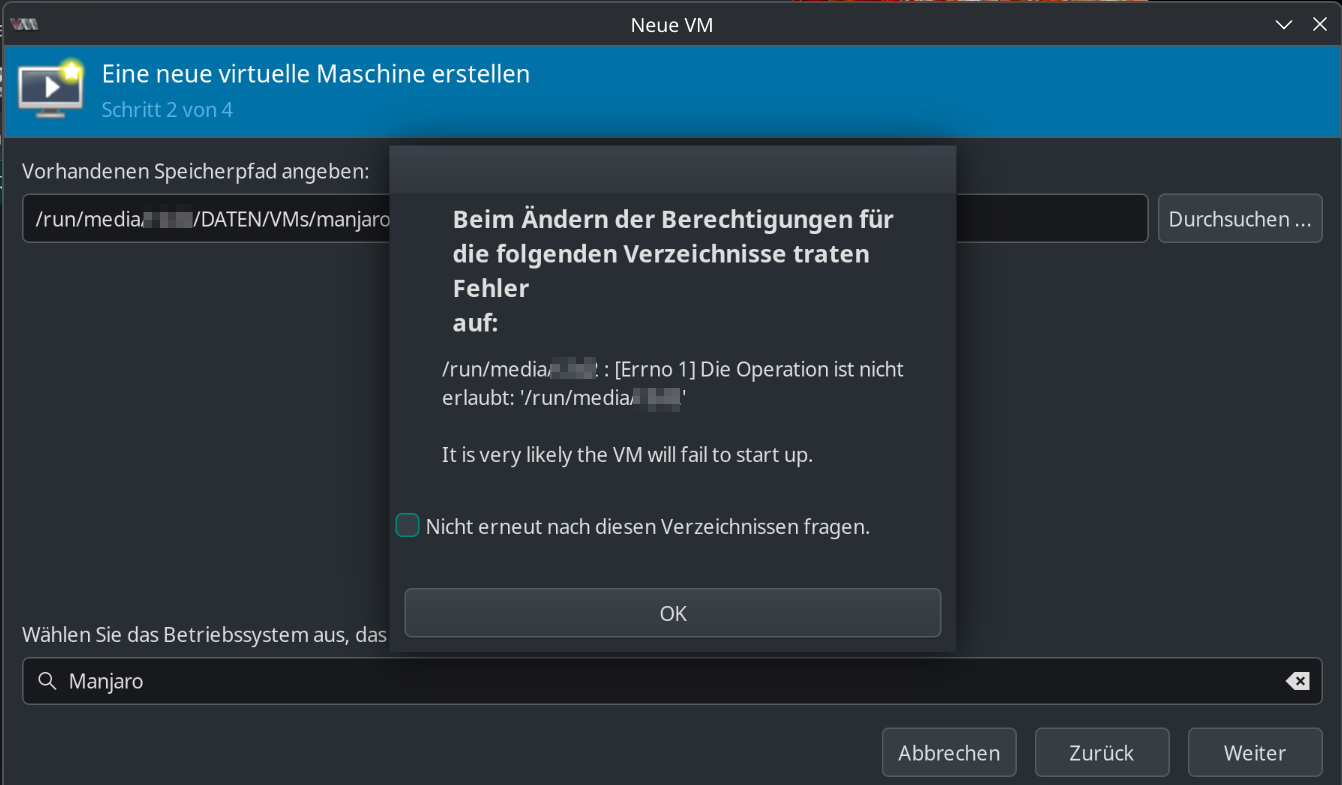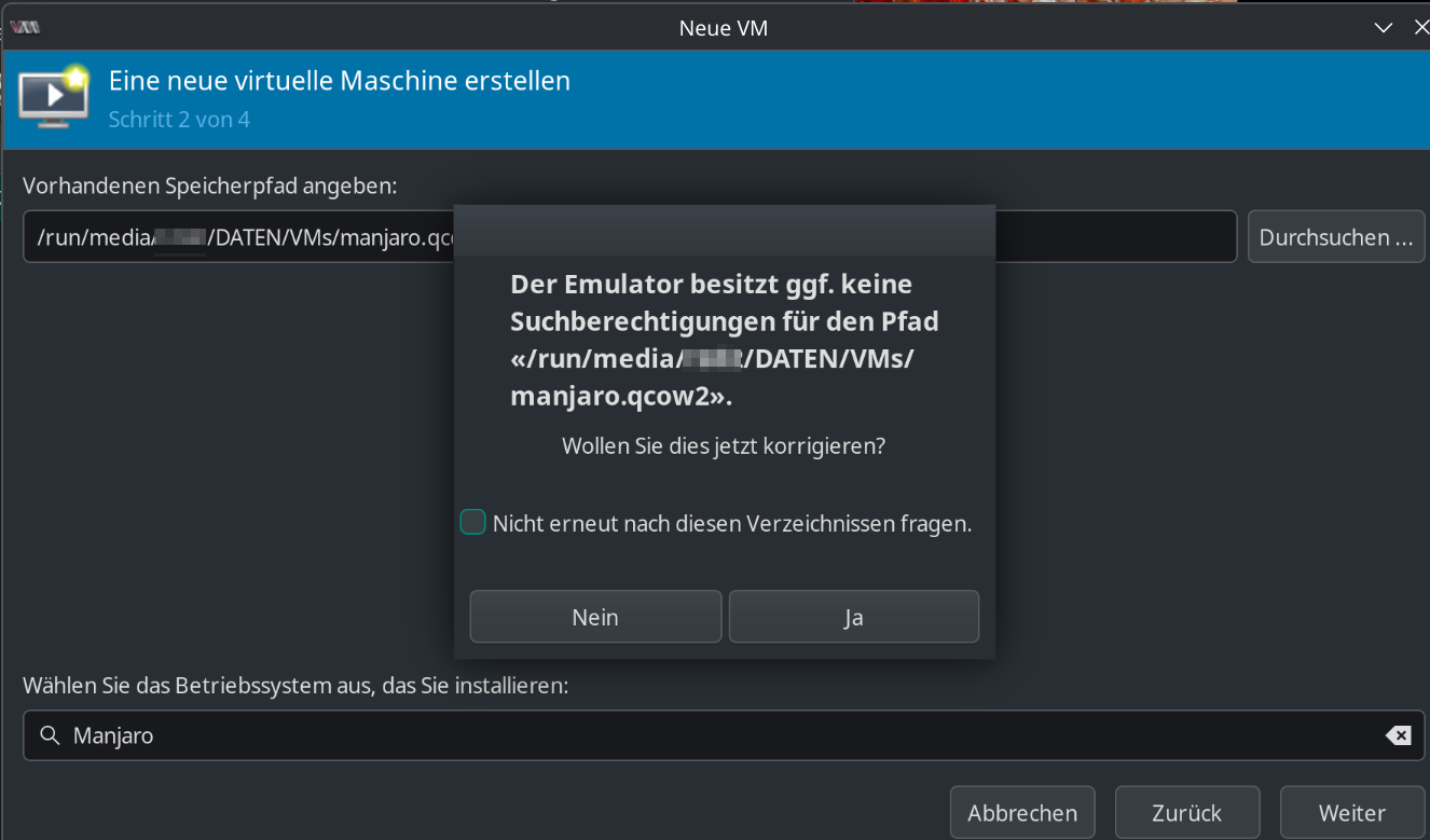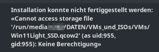Installation konnte nicht fertiggestellt werden: «Cannot access storage file '/run/media/test/DATEN/VMs_und_ISOs/VMs/Win11Light_SSD.qcow2' (as uid:955, gid:955): Keine Berechtigung»