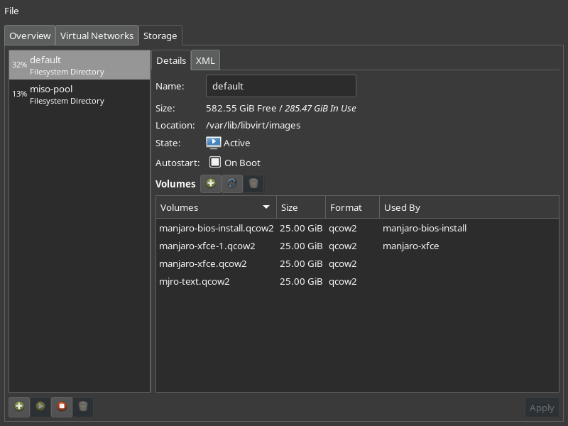 With this in place, keep the disk attached and open the Virtual Machine Manager application, and navigate to the QEMU/KVM Storage tab as described above