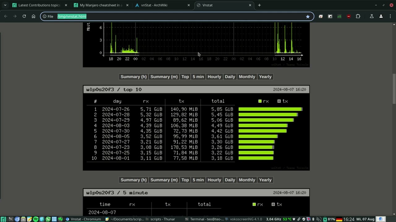 I am currently out of my primary appartment and using metered mobile connection, so i needed a way to monitor my traffic. Vnstat seemed to be the best and lightest option.