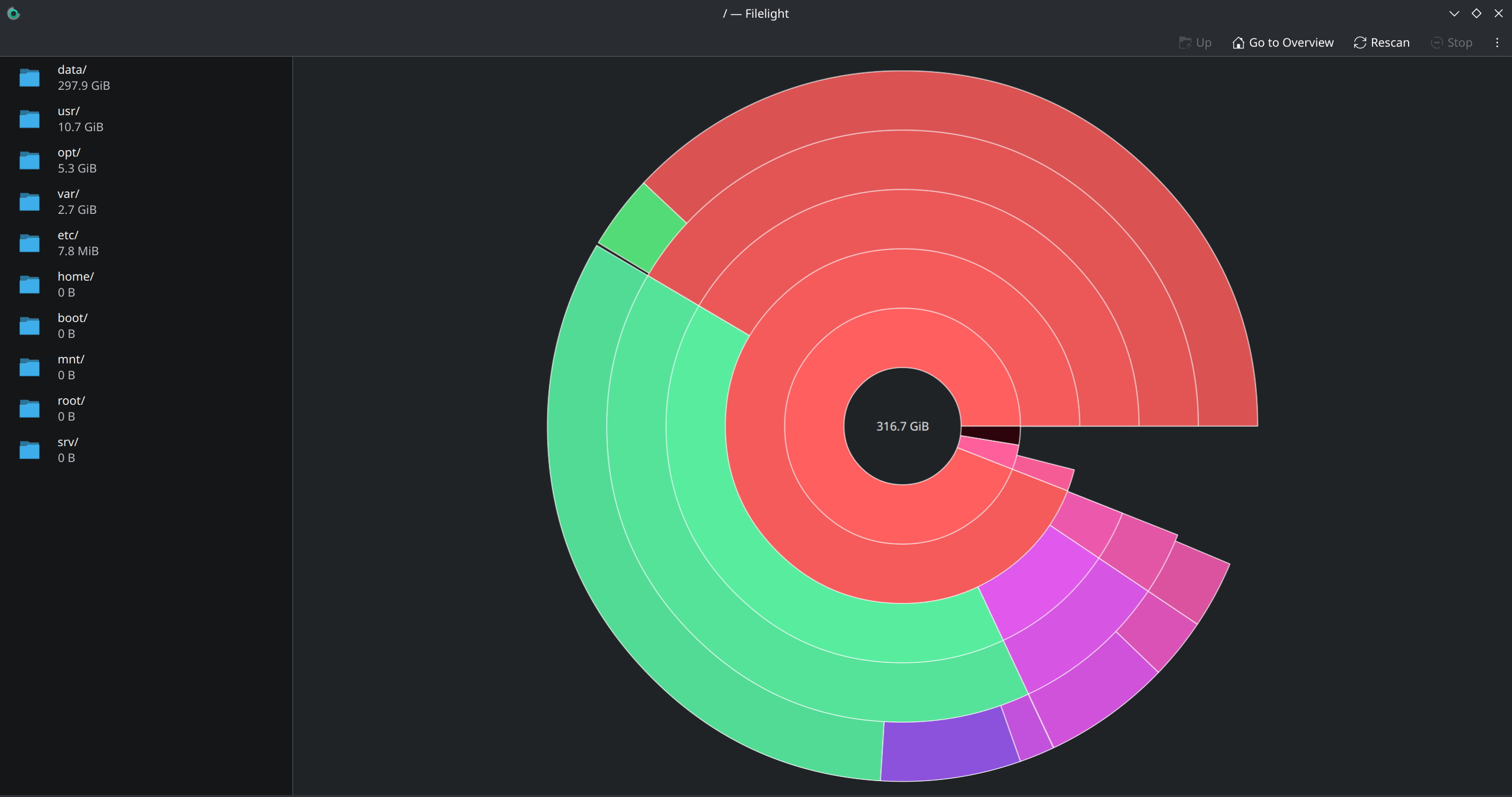 Please do not post images of text. A nice gui program to graphically show the space is baobab. Or for kde - filelight. On the command line, check also what du has to say. If you have sparse files like qcow2 virtual disks it may differ from df.